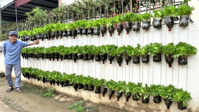 Bottles can be arranged vertically or horizontally, creating a green wall or decorative garden.
