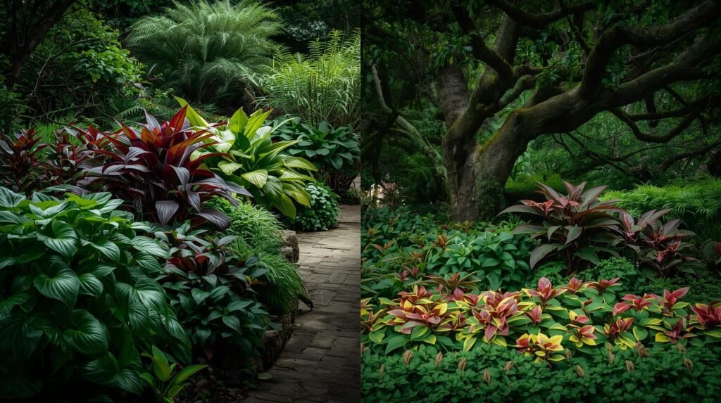 | Caladium | Partial shade | Fast | Tropical appearance |
