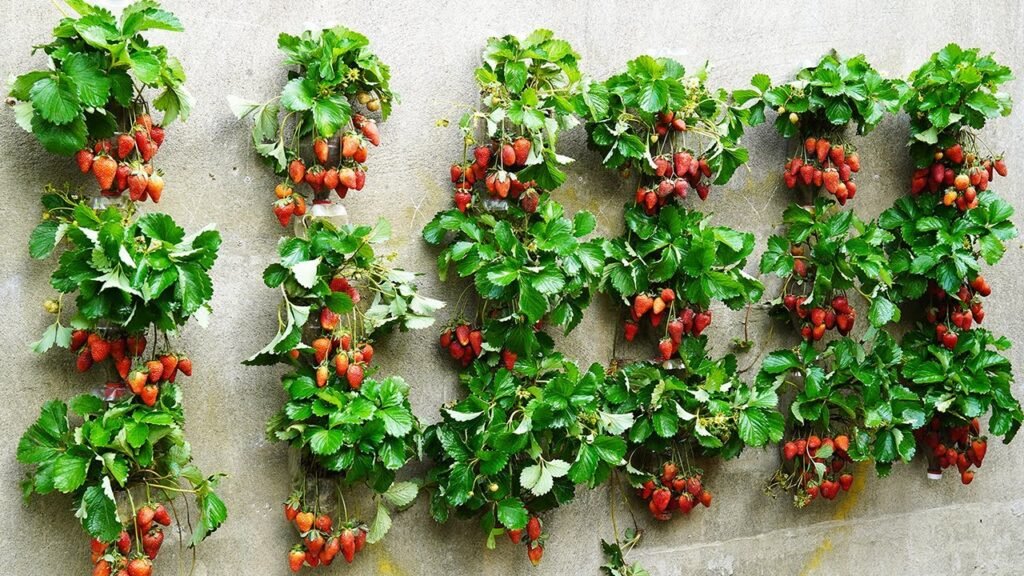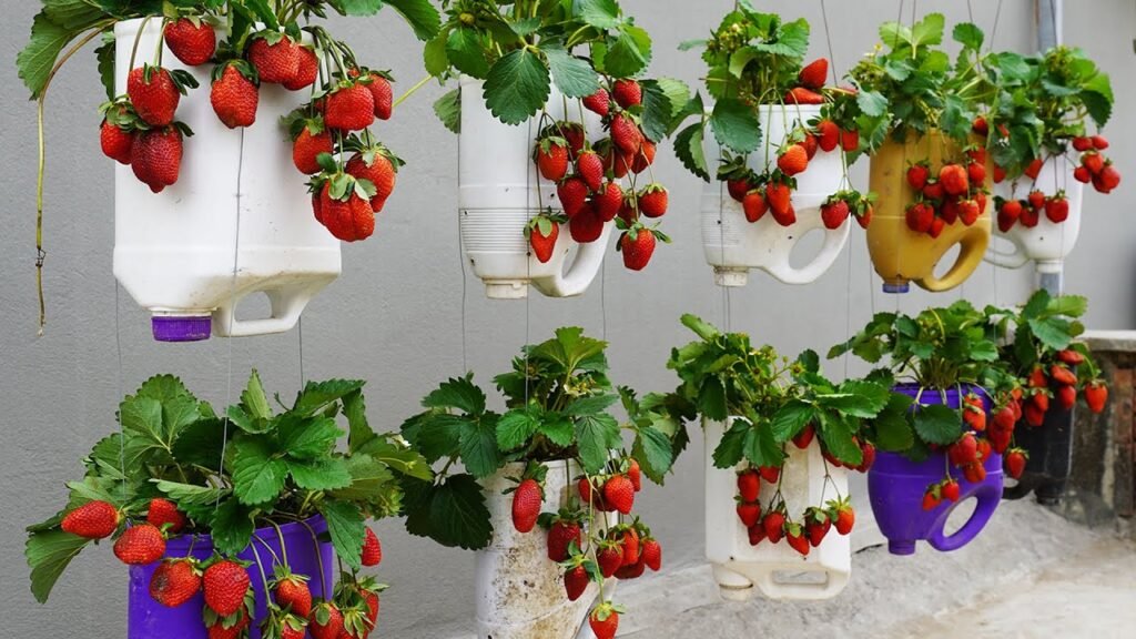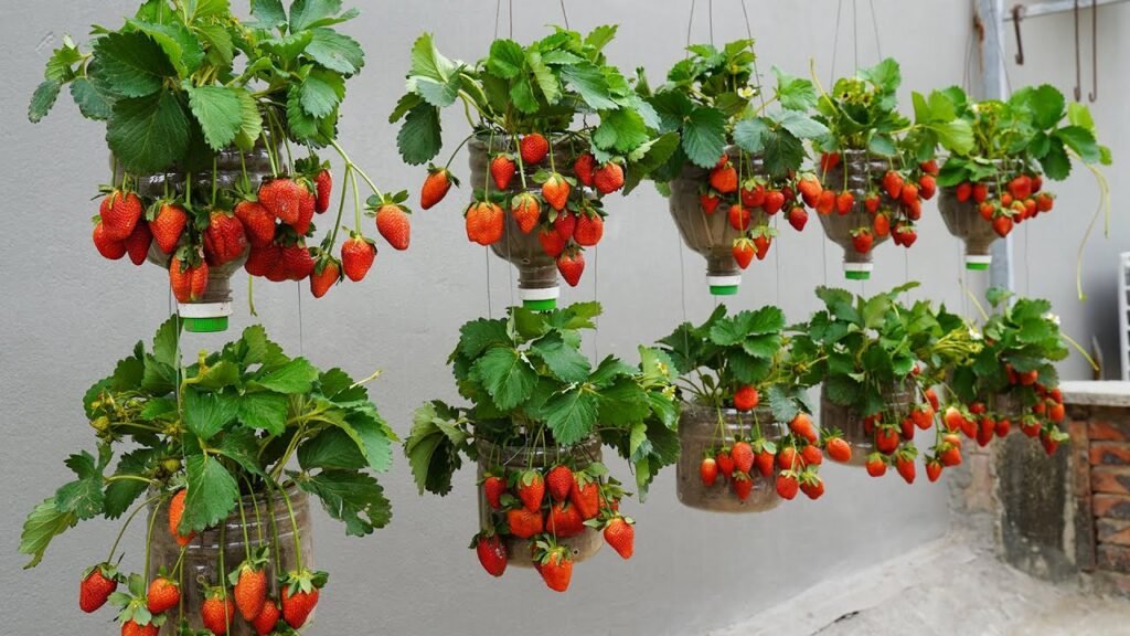 Strawberries are one of the easiest fruits to grow vertically. Their shallow roots and compact growth make them perfect for containers of all shapes and sizes—including cut plastic bottles.